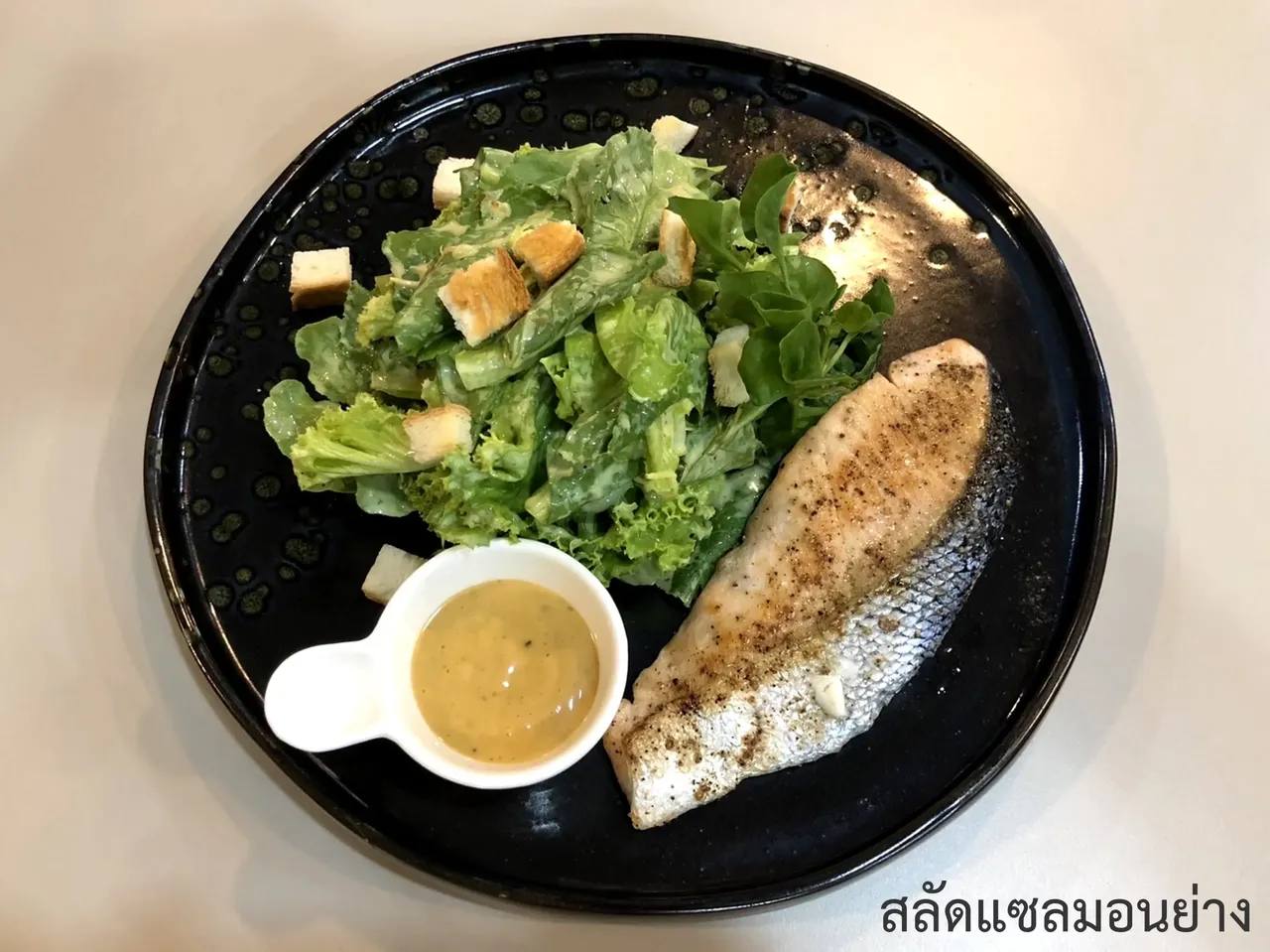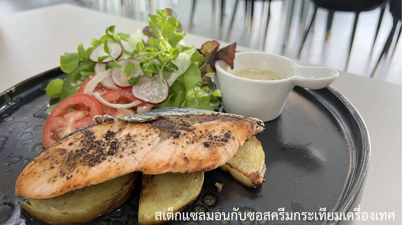 สเต็กเเซลมอนกับซอสครีมกระเทียมเครื่องเทศ​