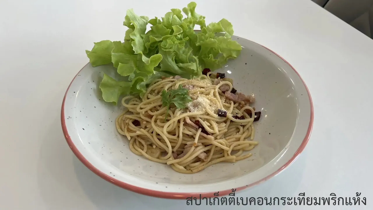 สปาเก็ตตี้เบคอนกระเทียม พริกแห้ง