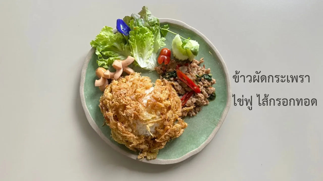 ข้าวผัดกระเพราหมู ไข่ฟู และไส้กรอกทอด